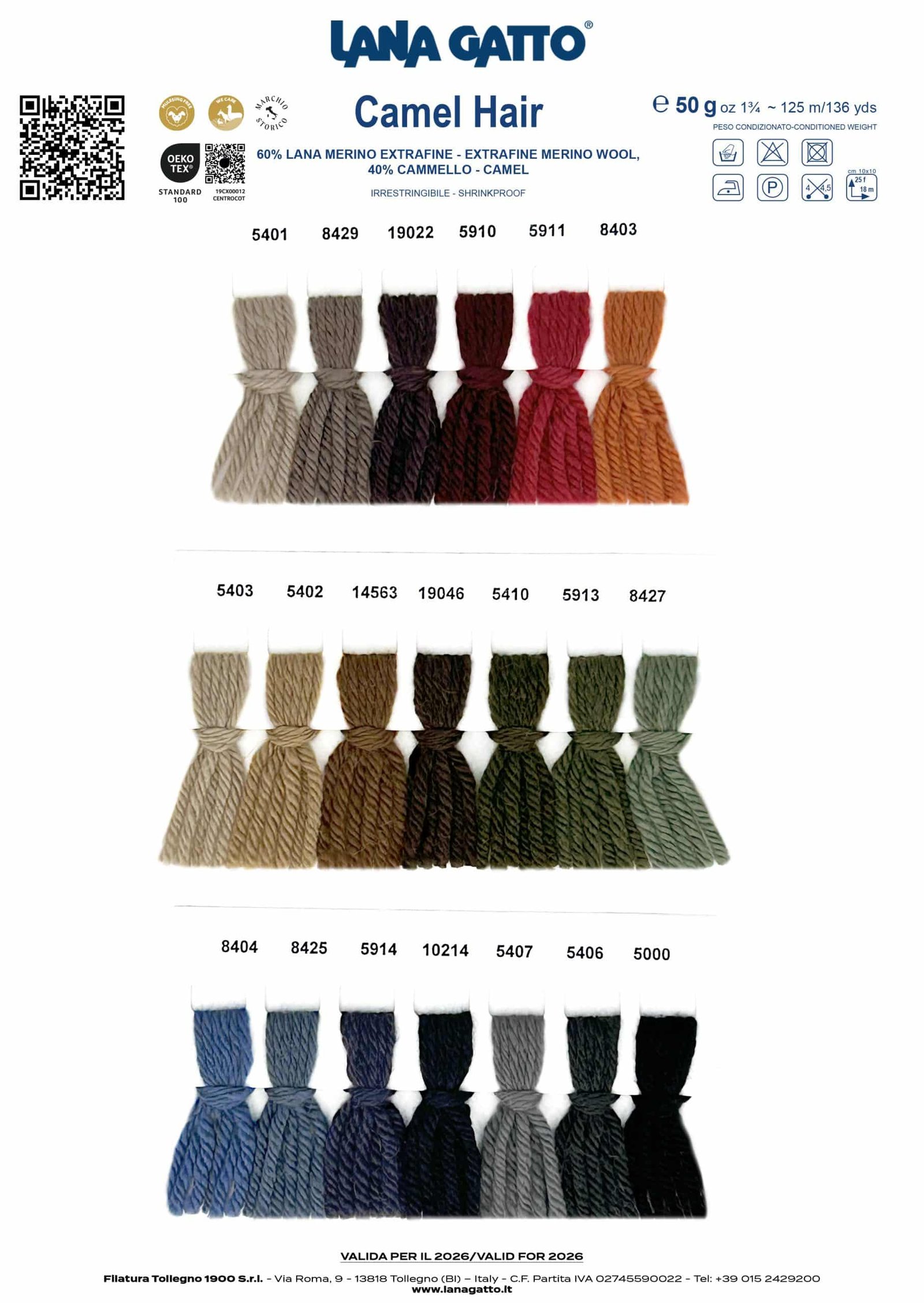 Lana Gatto Camel Hair dzija ir augstas kvalitātes merino un kamieļa vilnas maisījums, kas apvieno dabisku maigumu, siltumu un eleganci. Dzija sastāv no 60% ekstrasmalkas merino vilnas un 40% kamieļa vilnas, nodrošinot ideālu līdzsvaru starp mīkstumu, izturību un termoregulāciju.